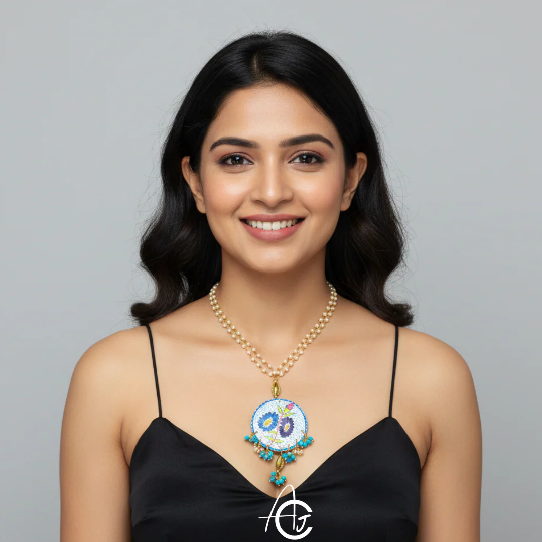 Bright Pushplata necklace is designed and painted by hand. Pearl Beaded neck chain and beautiful charms match well with centerpiece. This beautiful piece is a must have in your jewelry collection.