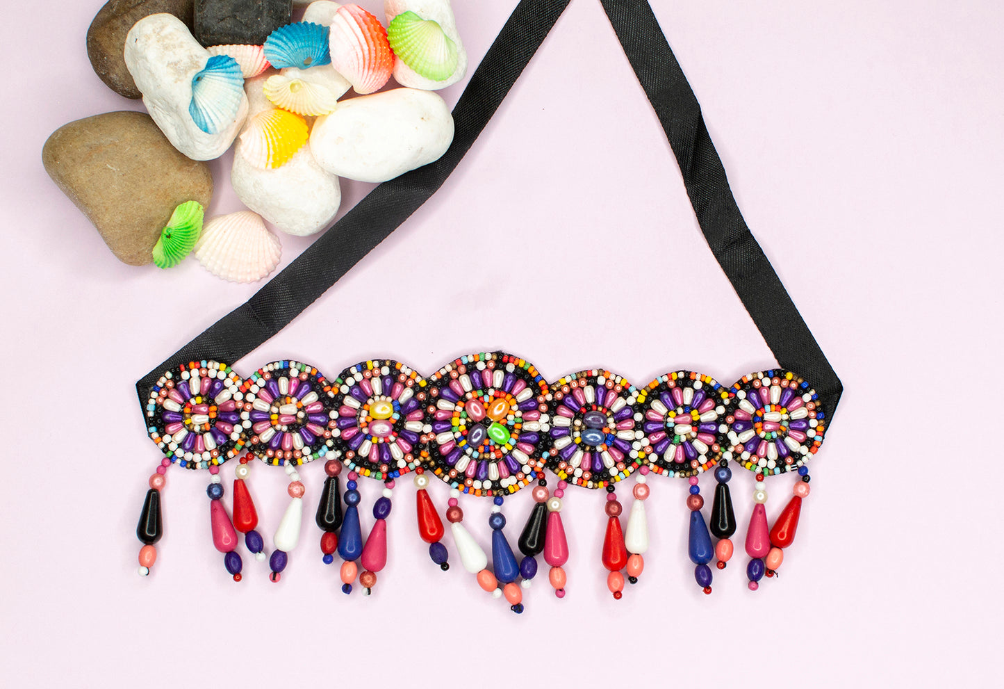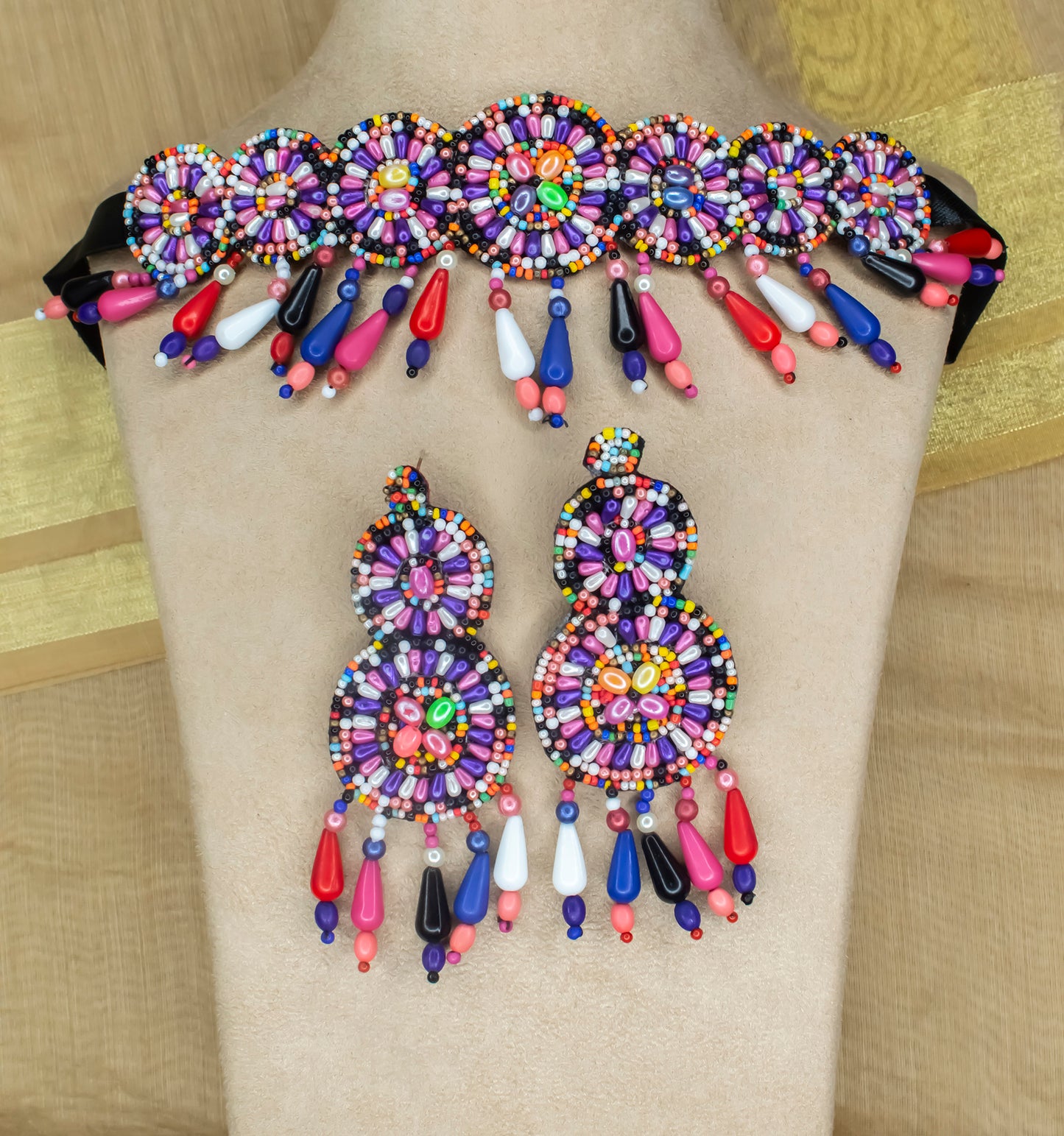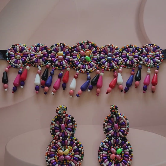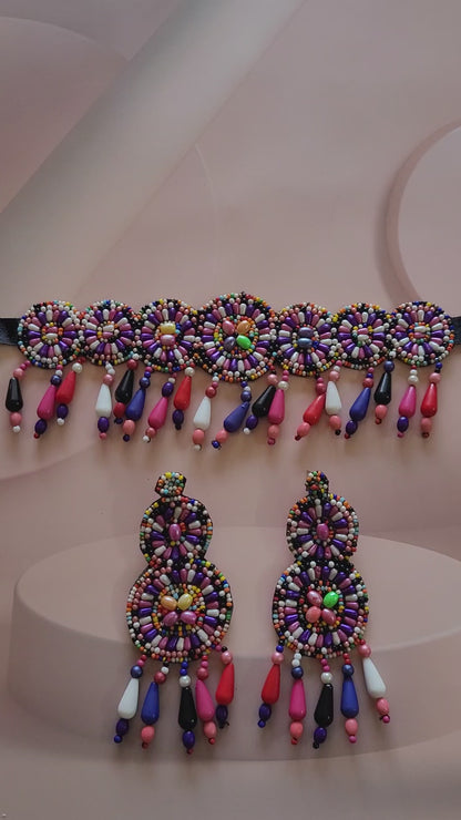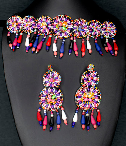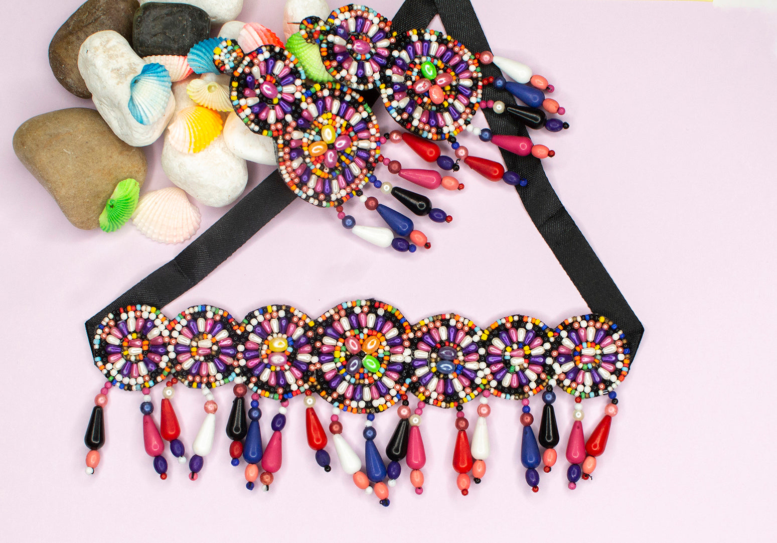 Rupali Choker Necklace Set is a beautifully crafted piece of handmade jewelry that features intricate embroidery work. The choker-style necklace sits snugly around the neck and is adorned with delicate threadwork that creates a stunning visual impact.