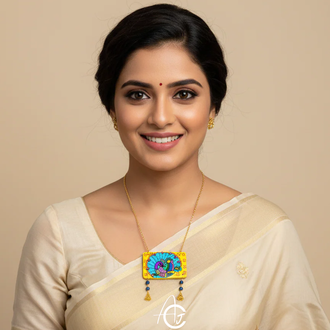 Dhvajee Necklace is designed and painted by hand in yellow, red, blue, green, pink and purple colour, by team ArtsCrafted. Golden neckchain and beautiful charms match well with centrepiece.  This beautiful piece is a must have in your jewellery collection.