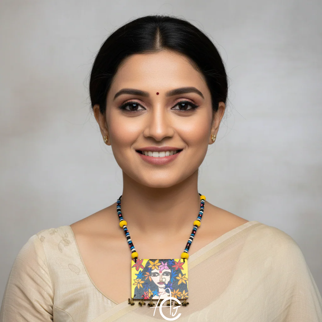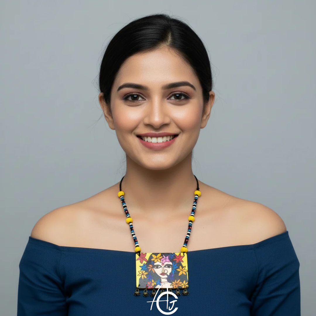 Beautiful Diva and flowers necklace is designed and painted by hand. Thread based neck chain has terracotta and thread beads matching with centerpiece. This beautiful piece is a must have in your jewelry collection.