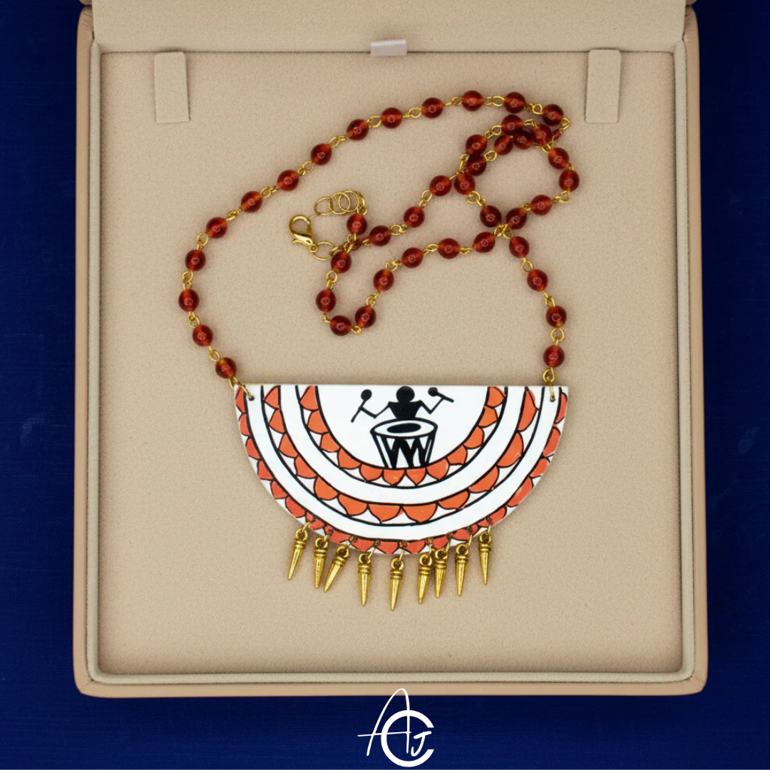 The Handpainted Drummer Necklace is a unique and visually appealing accessory that is perfect for adding a touch of cultural flair to your wardrobe. The necklace is made of high-quality materials and features an intricate Warli pattern that is hand-painted by skilled artisans.