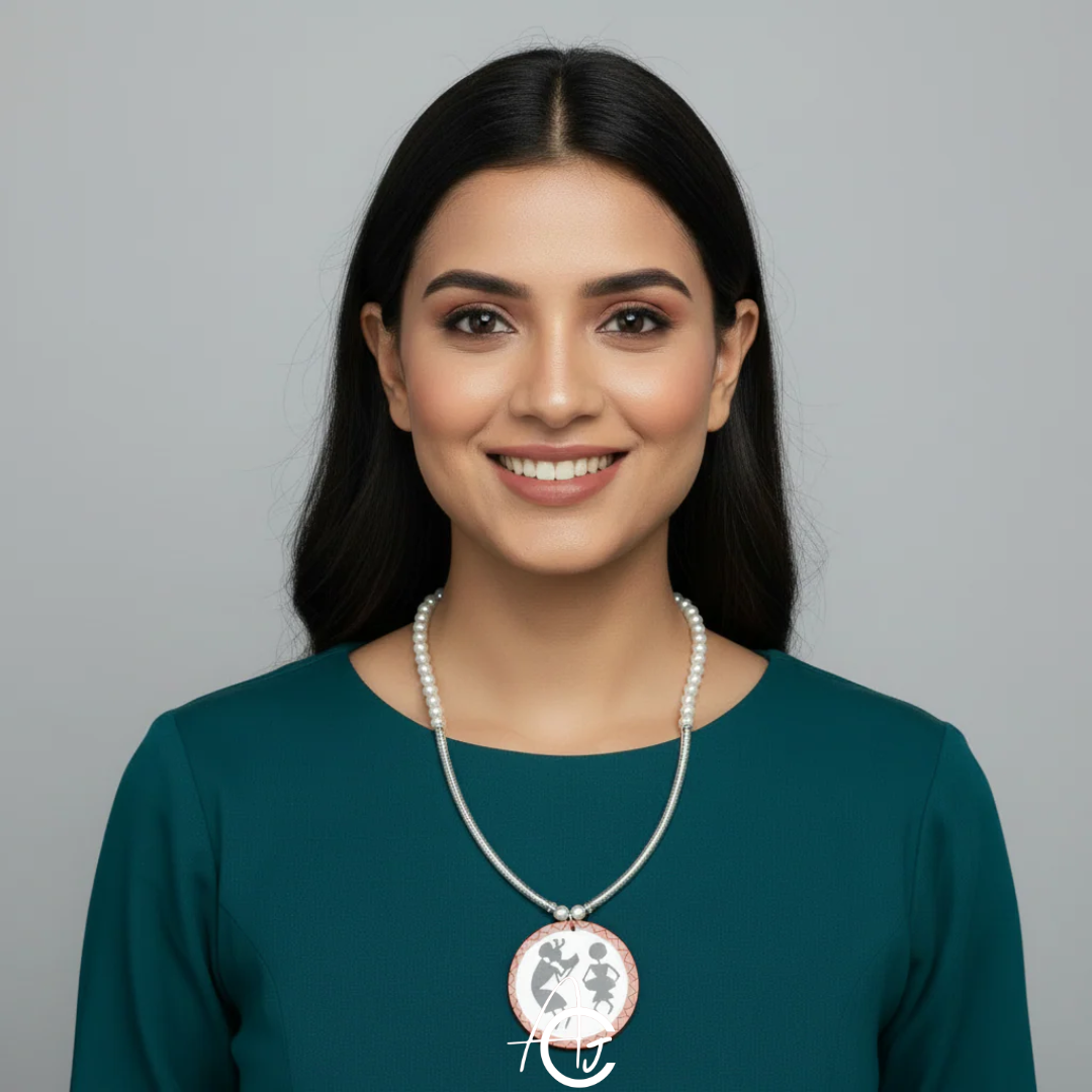 STYLING TIP : Whether you're dressing up for a special occasion or just looking to add a touch of cultural flair to your everyday outfits, the Dundubhi Necklace in Warli style is the perfect accessory.