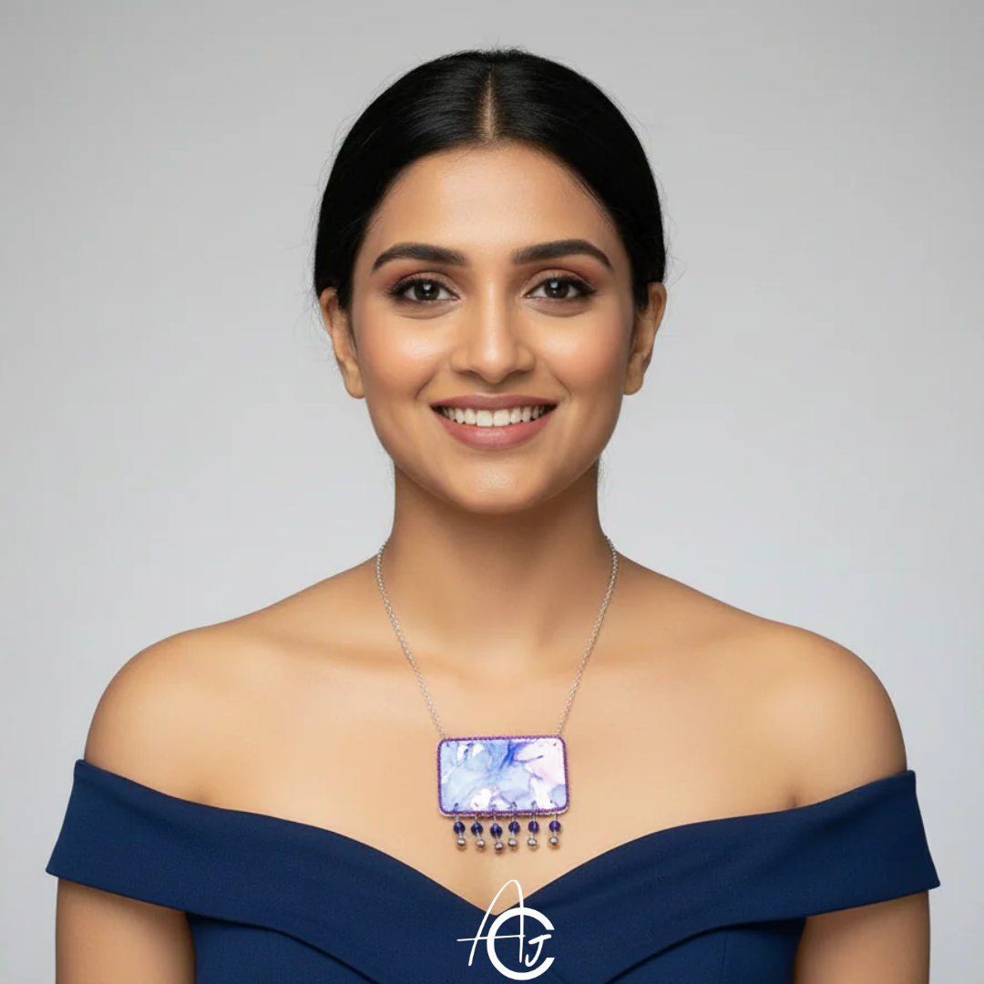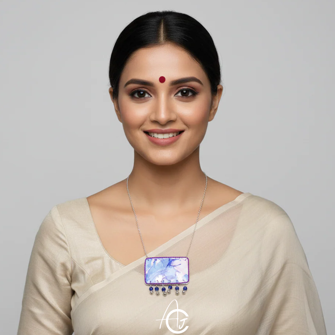 Beautiful necklace designed and painted by hand in various shades by team ArtsCrafted. This is a must have in your jewelry collection.
