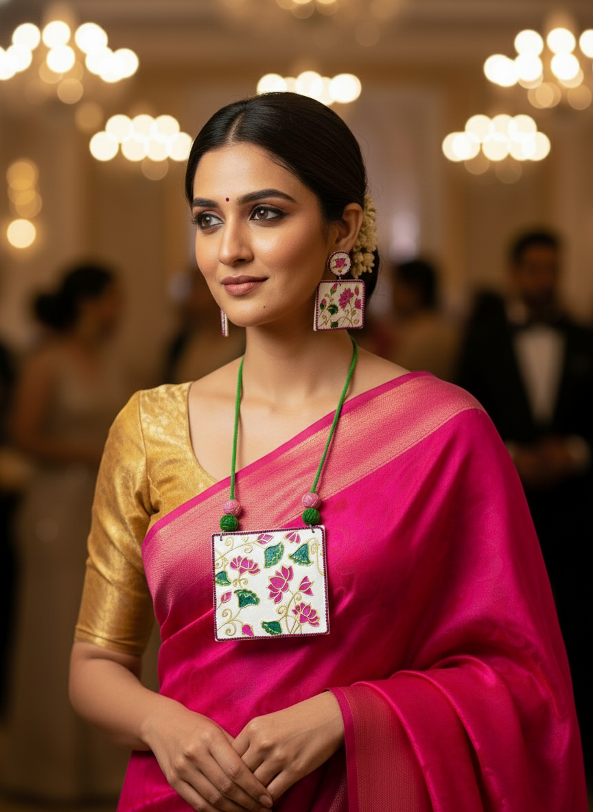 This floral, bright necklace with matching earrings in Lotus pattern is designed and painted by hand. The thread based green neck chain has beads matching with centerpiece. This is a must have in your jewelry collection.