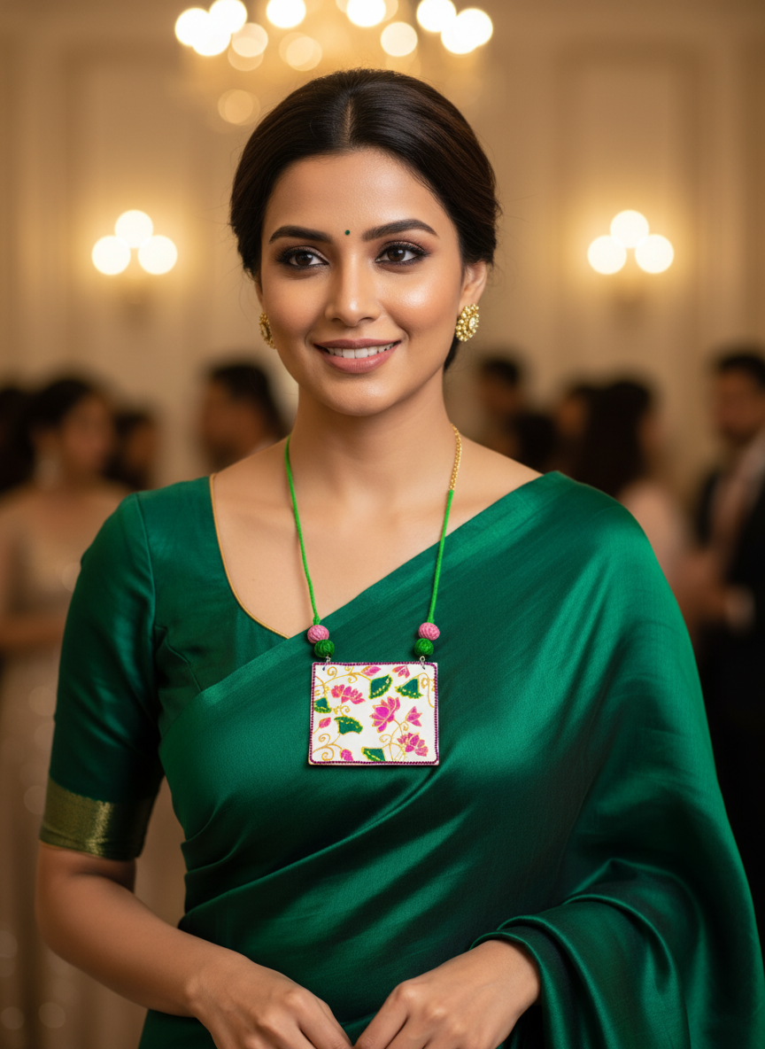 This Lotus pattern necklace is designed and painted by hand. The thread based green neck chain has beads matching with centerpiece. This is a must have in your jewelry collection.