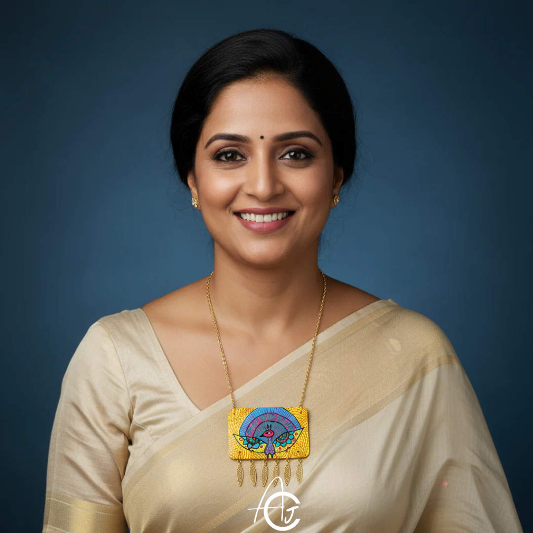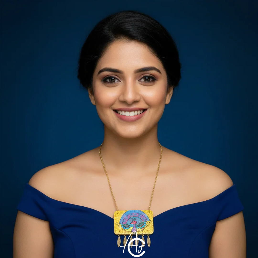 This bright necklace set is designed and painted by hand, by team ArtsCrafted. Golden neck chain and beautiful charms match well with centerpiece. Matching dangler earrings complete the look. This beautiful piece is a must have in your jewelry collection.