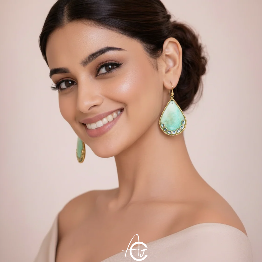 Beautiful, bright earrings are designed and painted by hand in various shades by team ArtsCrafted. The golden small beads and Kundan complete the look. This is a must have in your jewelry collection.