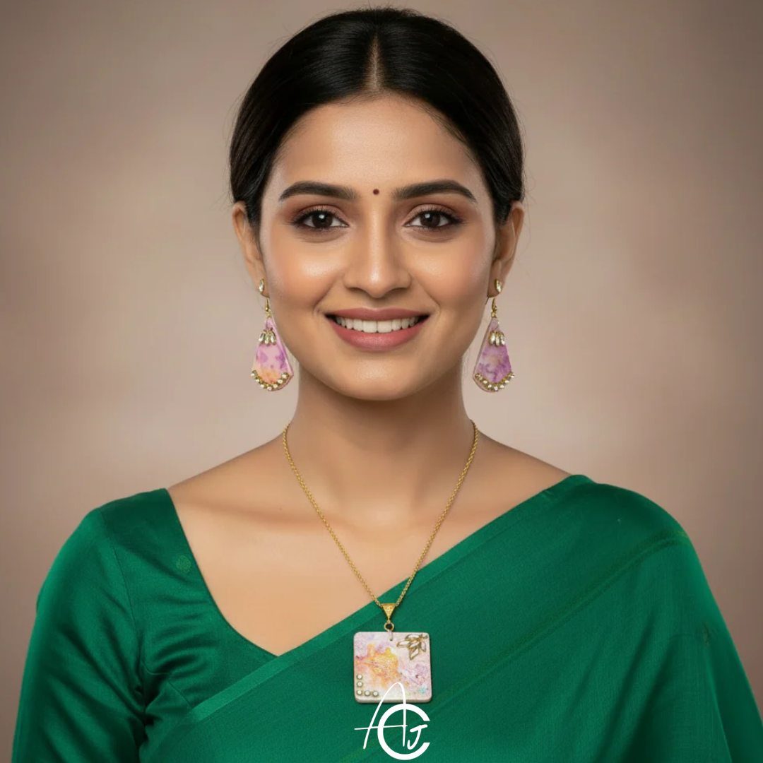 Material : Made with light weight, high quality materials and water-resistant elements. Alcoholic ink fluid work on wood, Kundans, metal charms with chain.