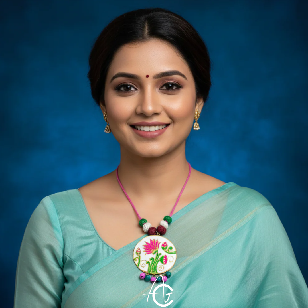 Floral Sameeksha bright, Lotus pattern necklace is designed and painted by hand in the shades of pink and green, with a tinch of golden, by team ArtsCrafted. Matching coloured small ghungroo latkan complete the looks. The thread based pink neckchain has beads matching with centrepiece. This is a must have in your jewellery collection.