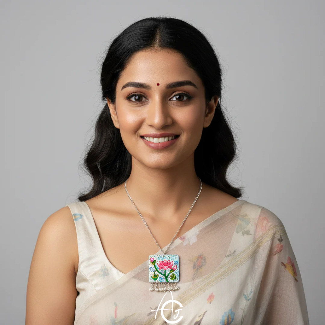 Floral, bright Lavina necklace in Lotus pattern is designed and painted by hand in the shades of pink and green, with a tinch of blue, by team ArtsCrafted. The silver neckchain with pearl charms complements the centerpiece. This is a must have in your jewellery collection.