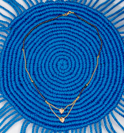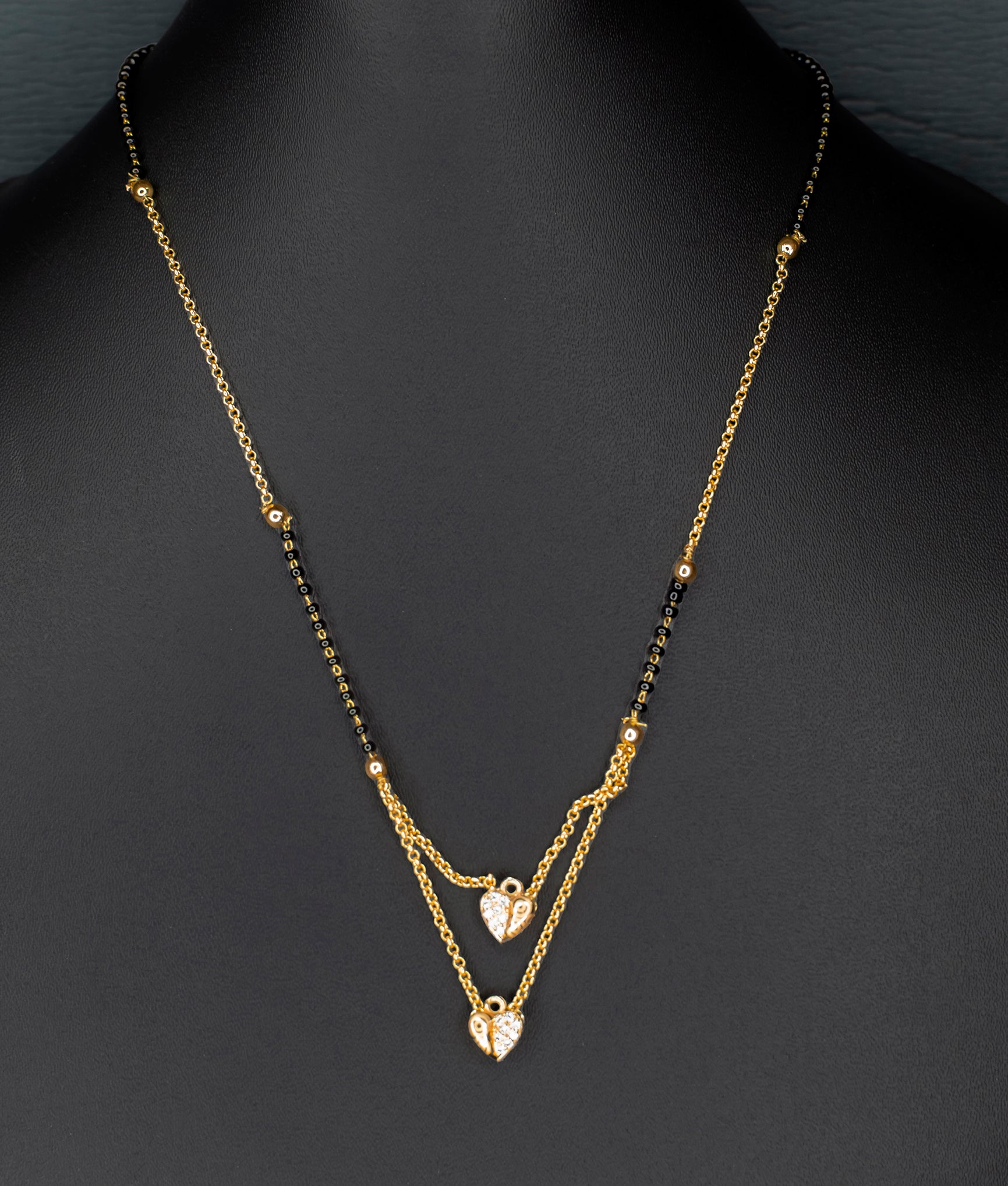 Sahiba Mangalsutra is set in a beautiful gold tone with black beads. This special jewellery piece combines traditional and modern styles in a really pretty way. You can wear it for any occasion to show love, togetherness, and commitment. This mangalsutra is a great way to make your style even more special and it will always look amazing.