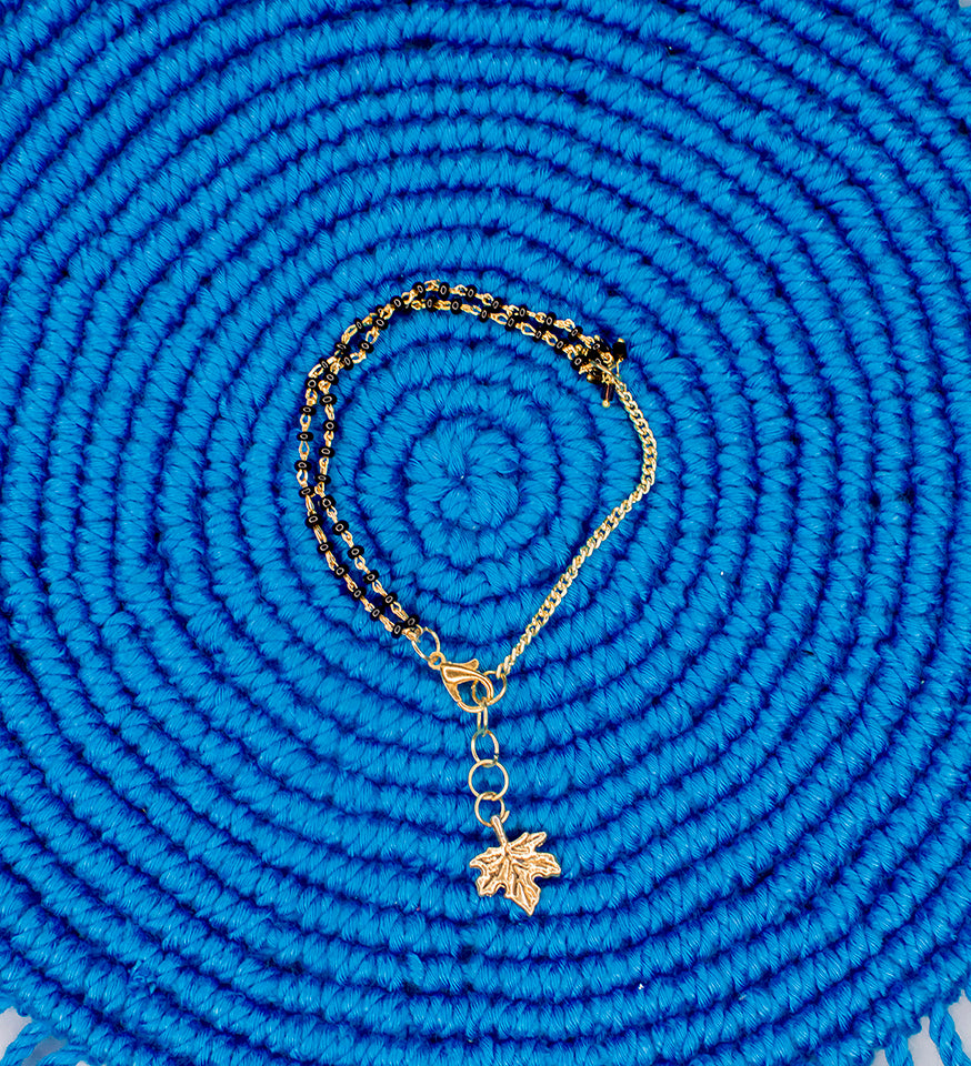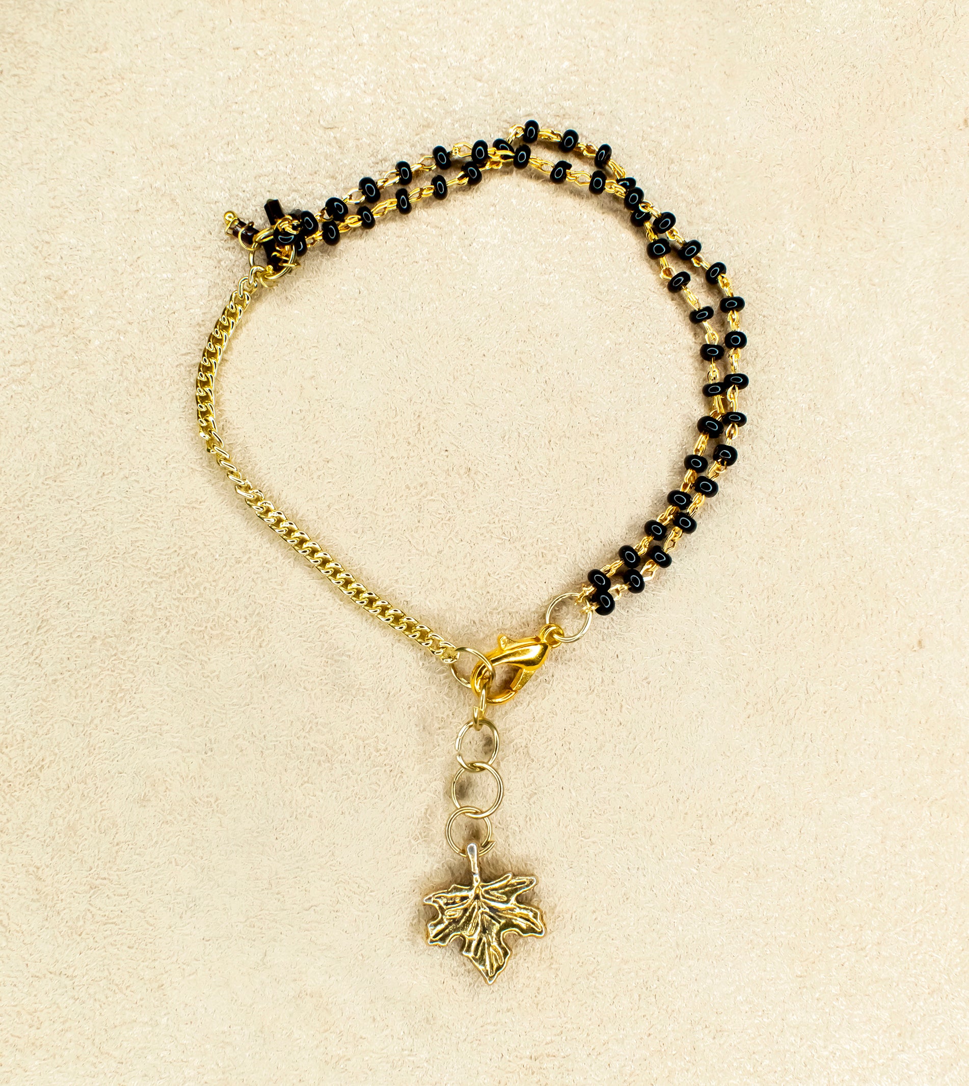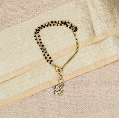 Vaishvi Mangalsutra Bracelet: Handmade Jewellery piece carefully made by hand in a beautiful gold tone with black beads. This special bracelet combines traditional and modern styles in a really pretty way. You can wear it for any occasion to show love, togetherness, and commitment. It's easy to adjust to fit your wrist comfortably. This bracelet is a great way to make your style even more special and it will always look amazing.