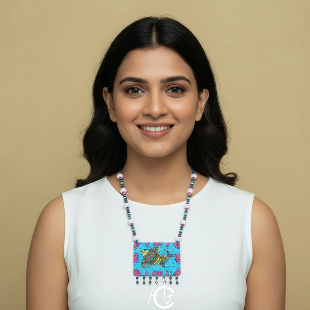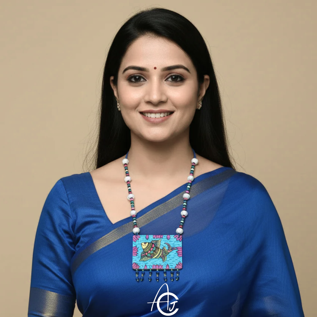 3. Handpainted Maaya Necklace's terracotta and threaded bead design makes it a perfect match for traditional or ethnic wear. Wear it with a saree, salwar suit, or lehenga for a stylish and unique look.