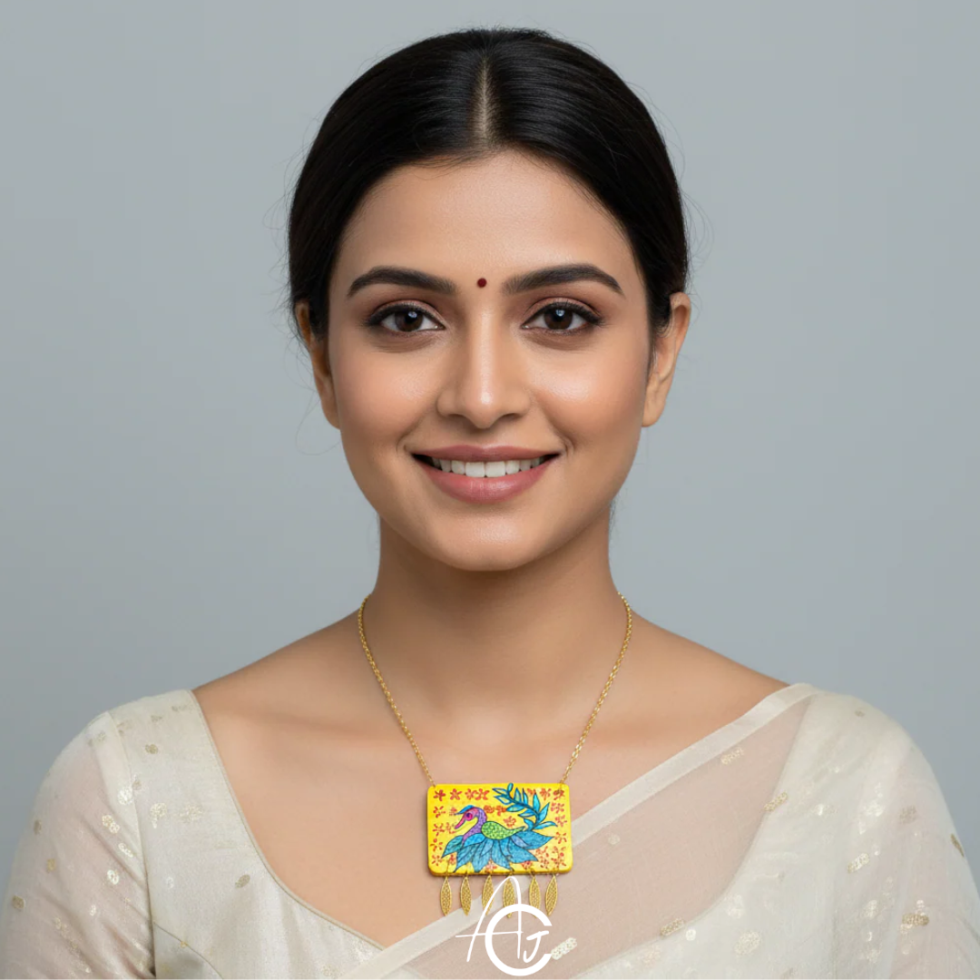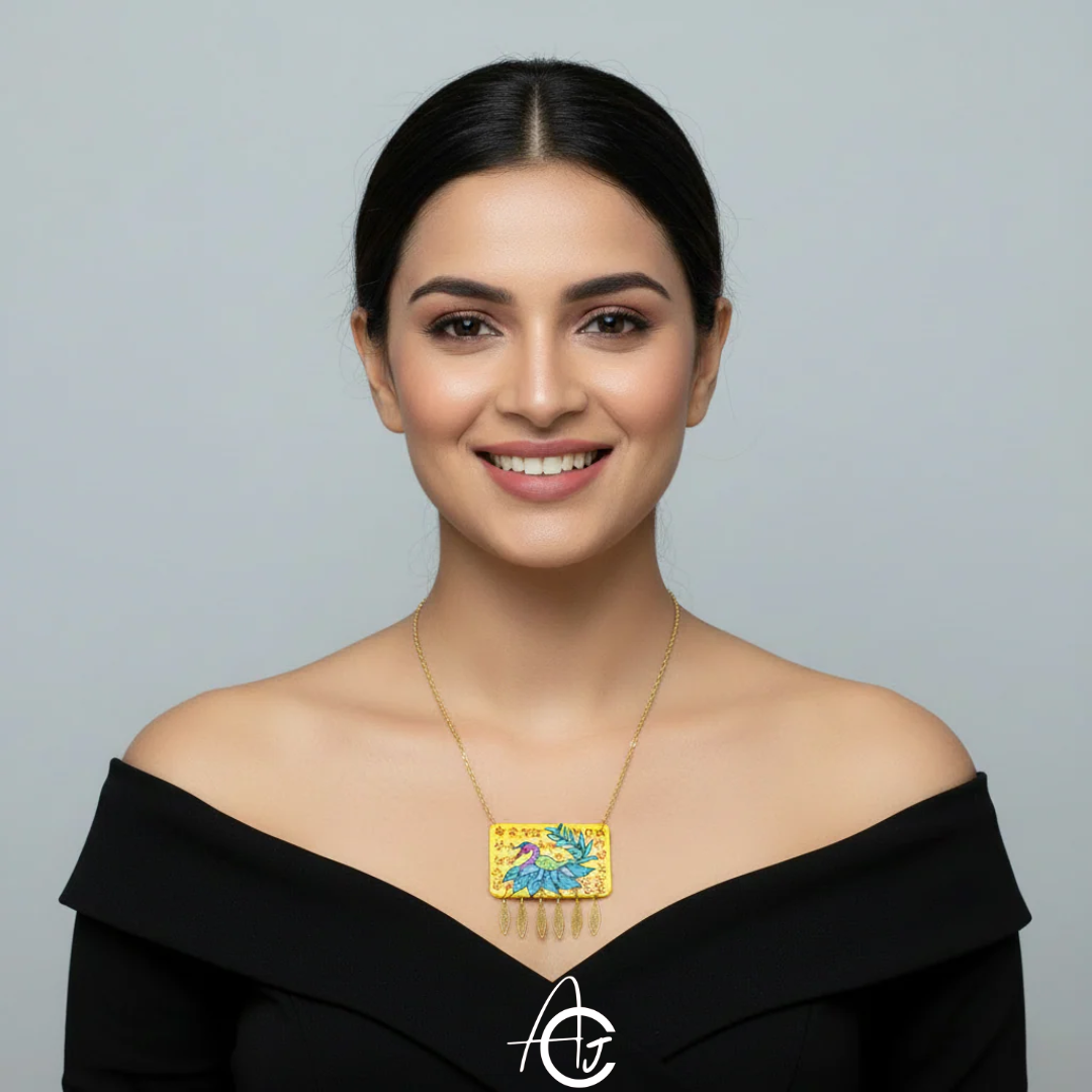 Namita bright necklace is designed and painted by hand in yellow, red, blue, green and pink colour, by team ArtsCrafted. Golden neckchain and beautiful charms match well with centrepiece. This beautiful piece is a must have in your jewellery collection.