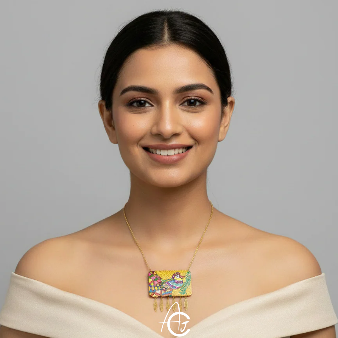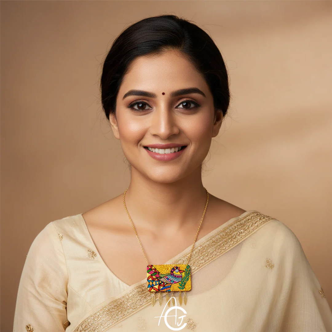 Mayuraa bright necklace is designed and painted by hand by team ArtsCrafted. Golden neckchain and beautiful charms match well with centrepiece. This beautiful piece is a must have in your jewellery collection.