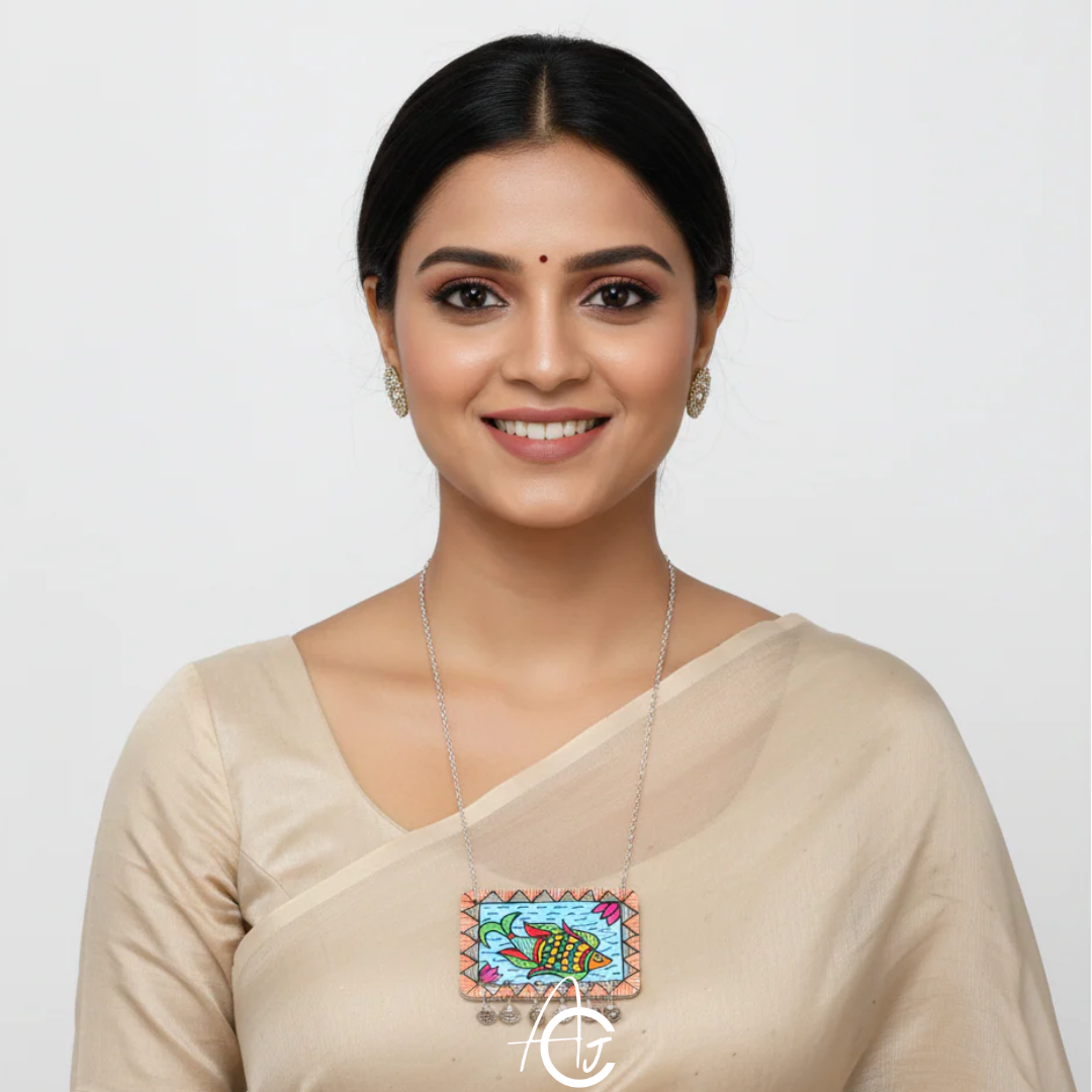 This bright necklace is designed and painted by hand by team ArtsCrafted. Silver neck chain and beautiful charms match well with centerpiece. This beautiful piece is a must have in your jewelry collection.