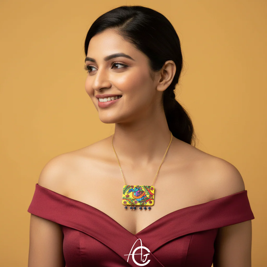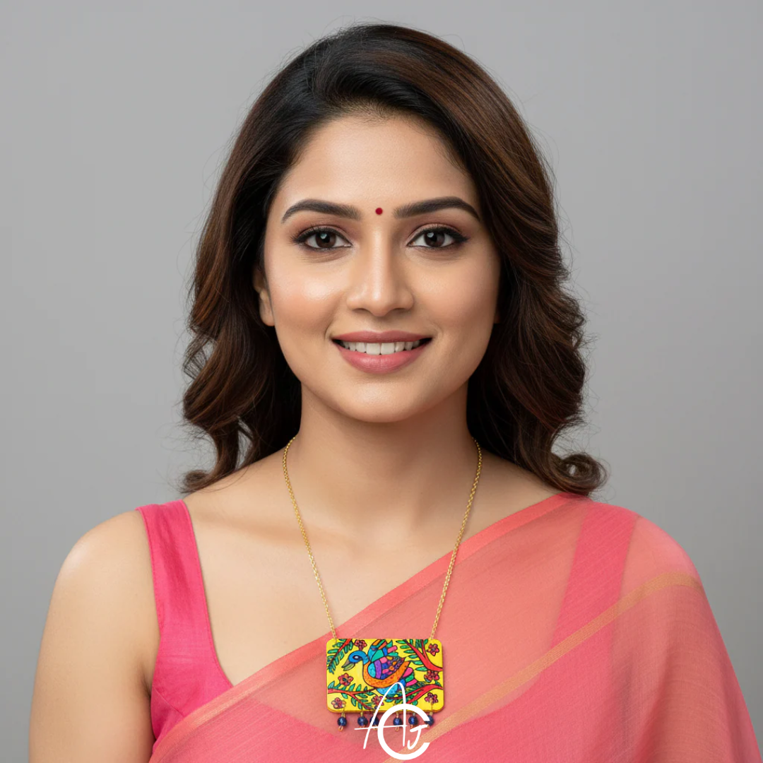 Add a touch of traditional Indian art to your jewelry collection with our Handpainted Madhumati Necklace. This unique handmade necklace features a stunning madhubani peacock design, meticulously crafted by skilled artisans. The vibrant colors and intricate details of this piece make it a true statement accessory.