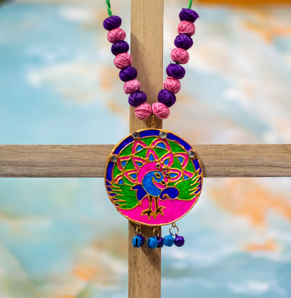 Bright PEACOCK necklace is designed and painted by hand in the shades of pink, blue and green, with the tinch of golden by team ArtsCrafted. The adjustible thread based green neckchain has beads matching with the centrepiece. The small matching ghungroos and Kundans complete the look. This is a must have in your jewellery collection.