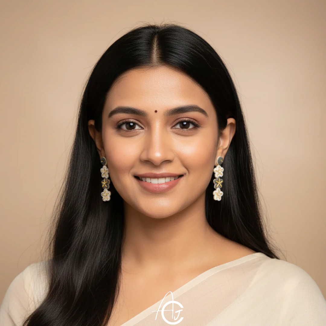 These beautiful embroidered earrings, are handcrafted and embroidered with seed beads and pearls. Matching studs enhance the looks. This piece of art is a must have in your jewelry collection.