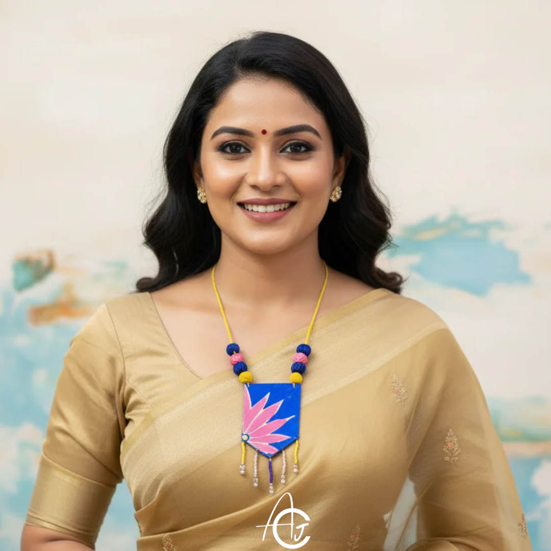 This floral, bright Sanya necklace is designed and painted by hand in the shades of pink and blue, by team ArtsCrafted. The thread based neckchain in yellow colour has beads matching with centrepiece. This is a must have in your jewellery collection.