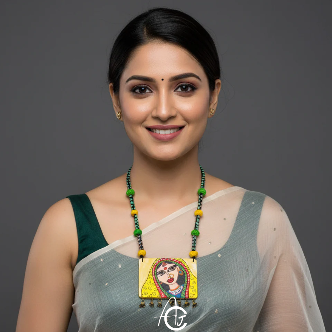 This bright necklace is designed and painted by hand. Thread based neck chain has terracotta beads and threaded beads matching with centerpiece. This beautiful piece of jewelry is a must have in your jewelry collection.