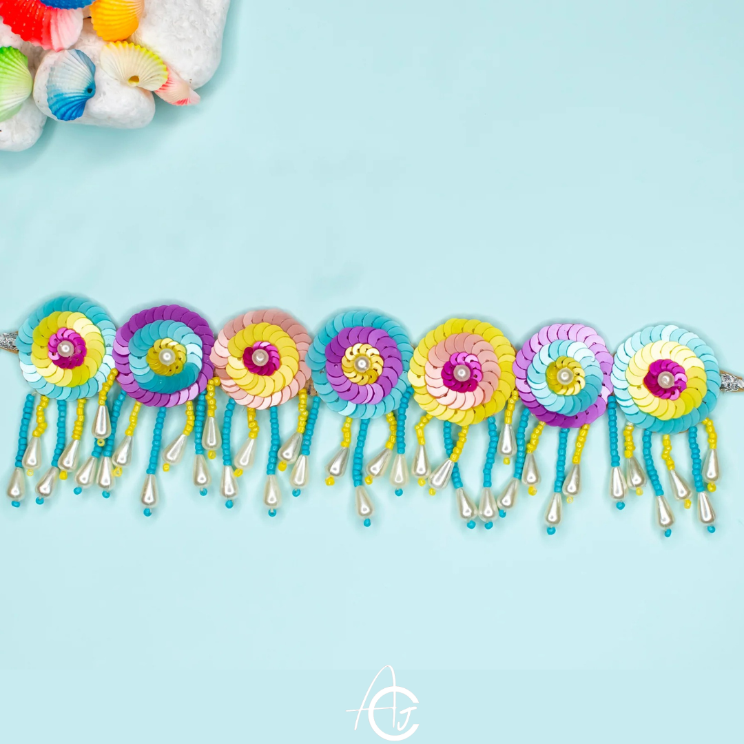 Embroidered Preyasi Necklace Set features a combination of Seed beads, Sequins and Pearls embroidery, consider pairing it with metallic accessories in a similar color scheme. A pair of gold or silver heels or a metallic clutch would complement the set nicely.