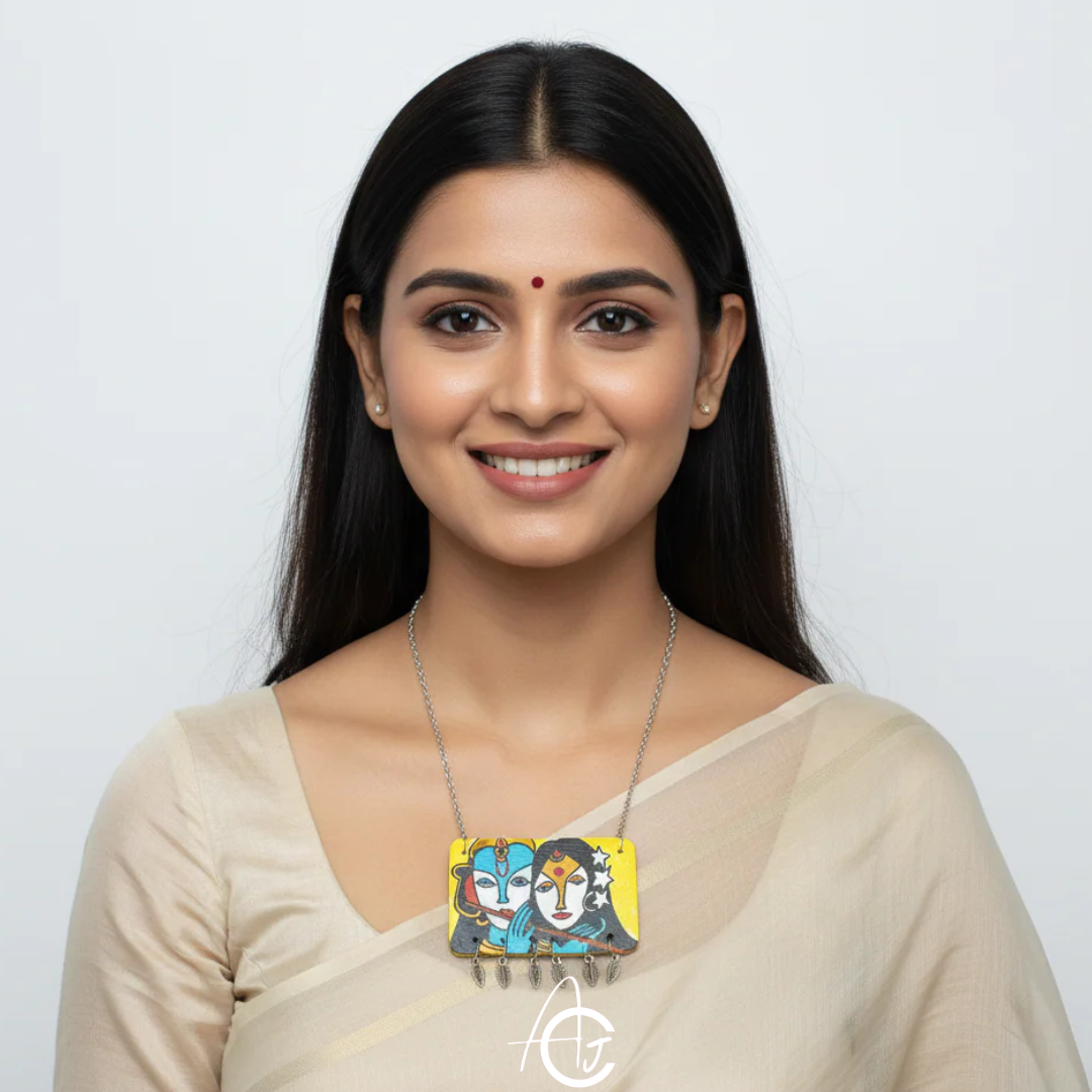 This bright necklace is designed and painted by hand, by team ArtsCrafted. Silver neckchain and beautiful charms match well with centrepiece. This beautiful piece is a must have in your jewellery collection.