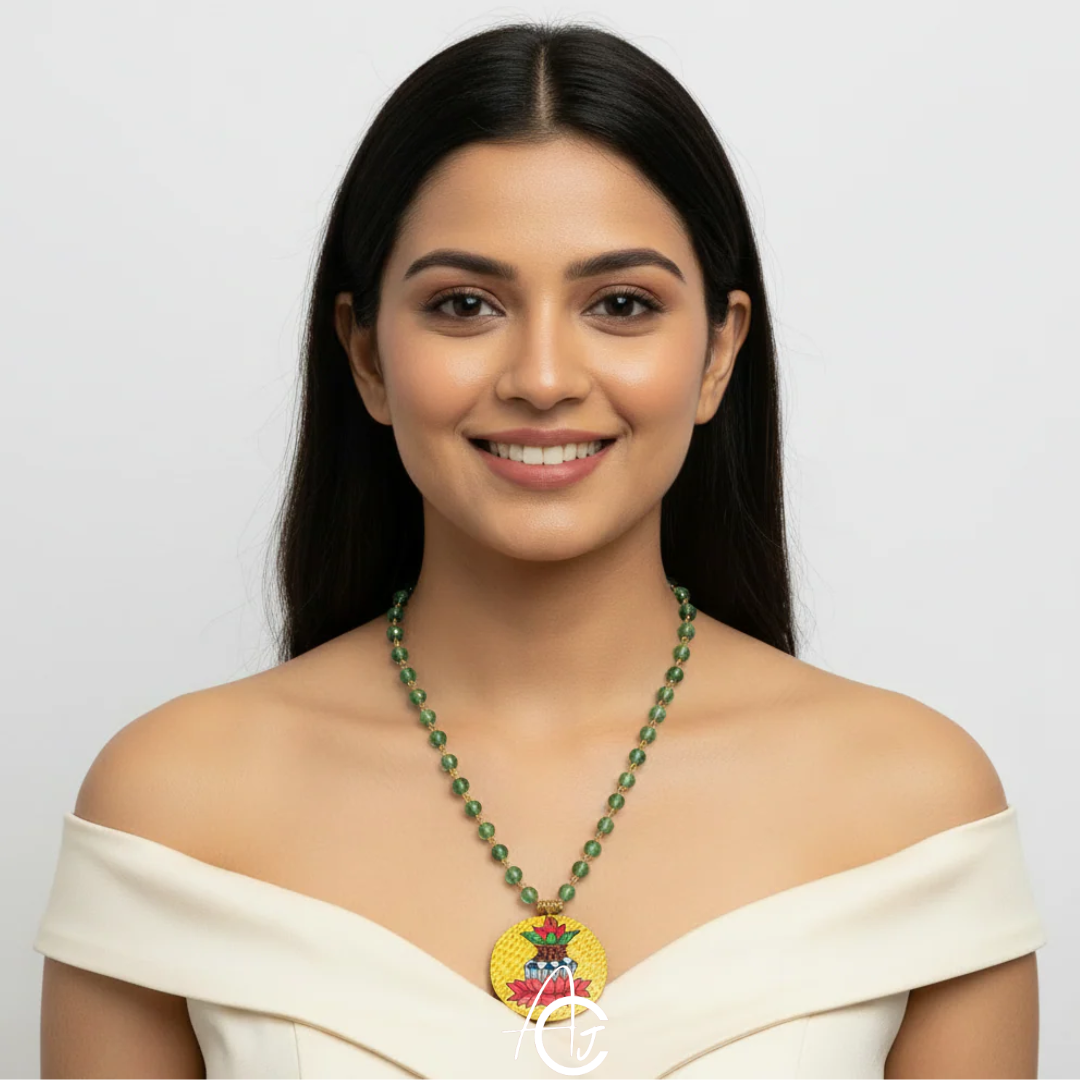Beautiful Shubham necklace is designed and painted by hand. Neck chain has beads matching with centerpiece. This beautiful piece is a must have in your jewelry collection.