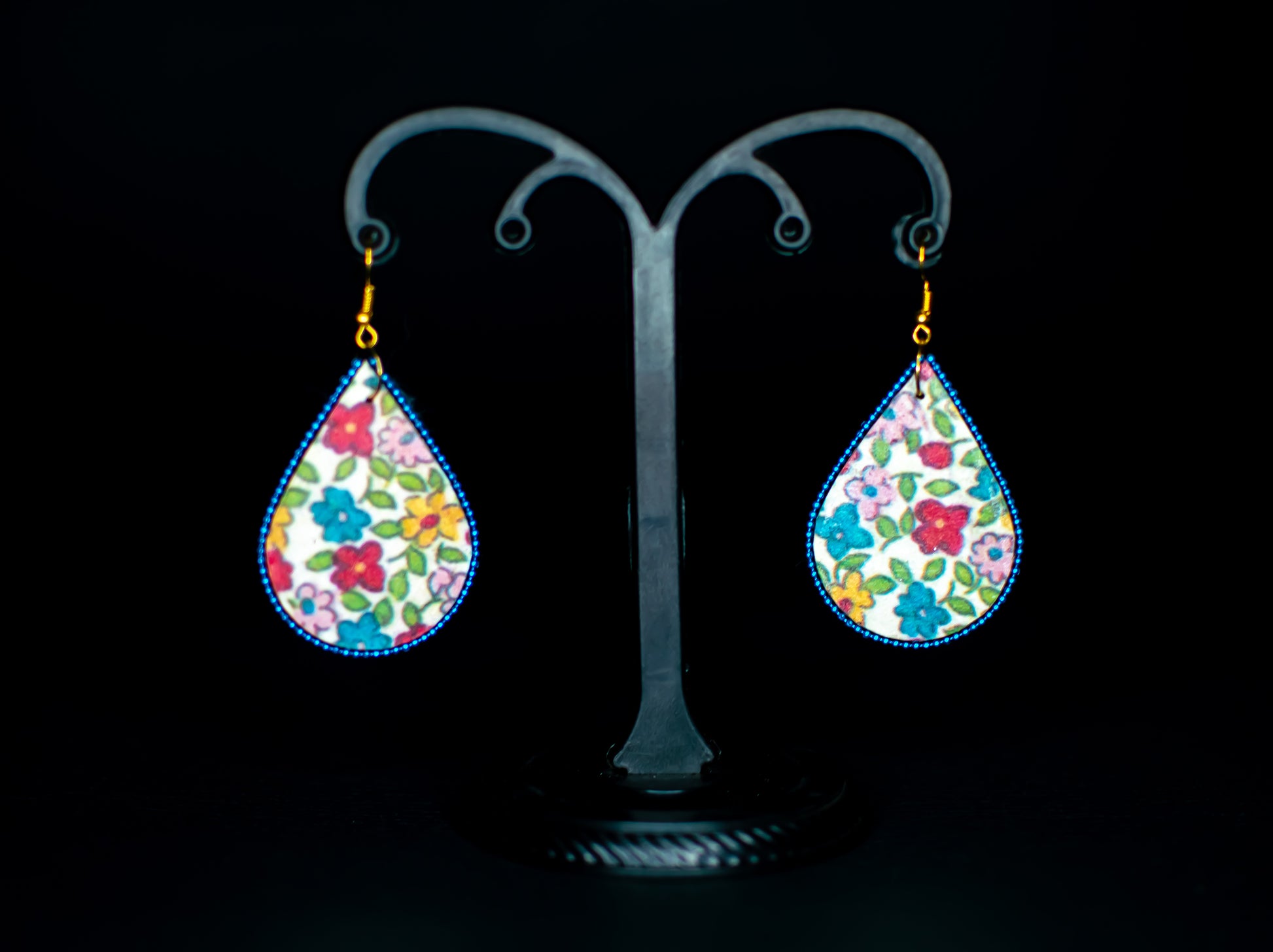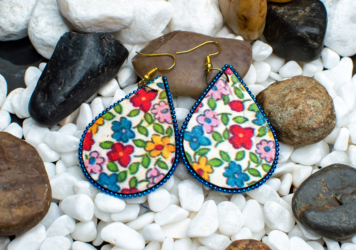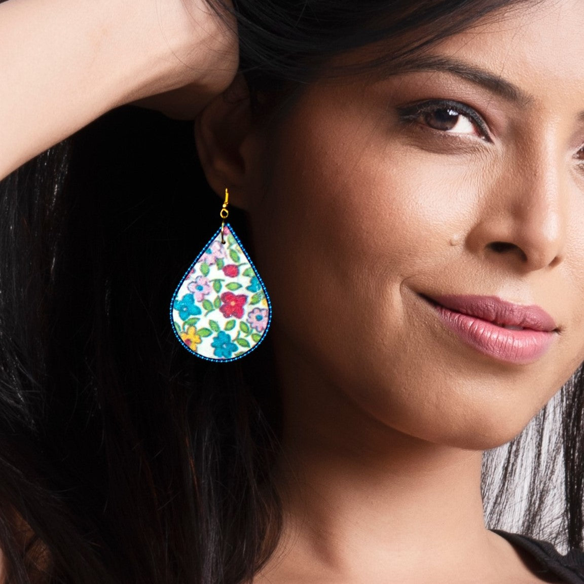 Beautiful, floral, bright Shaila earrings are designed and crafted by hand in various shades of pink, red, green, blue and yellow by team ArtsCrafted. The blue small beads complete the look. This is a must have in your jewellery collection.