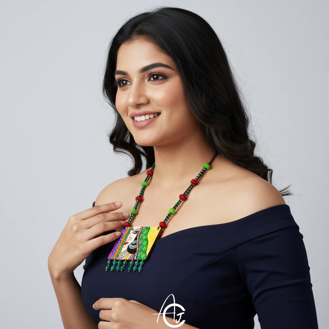 Bright Odhni necklace is designed and painted by hand. Thread based neck chain has terracotta beads and threaded beads matching with centerpiece. This beautiful piece of jewelry is a must have in your jewelry collection.